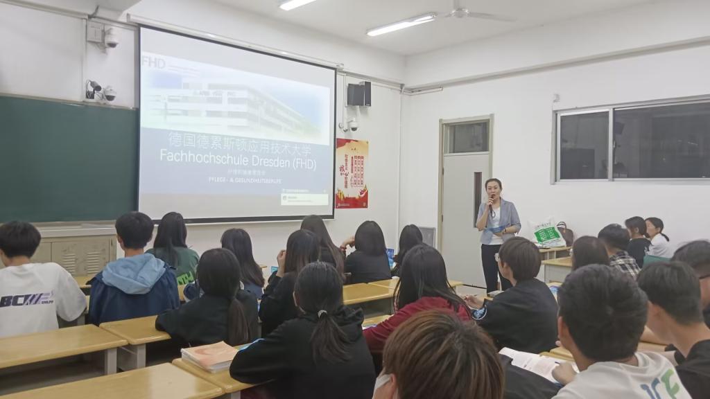 活动伊始,我校邀请中德教育相关负责老师给我系护理专业的同学们进行宣讲,活动分为两部分,第一部分主要由老师向同学们介绍德国护理行业的教育方式并说明同学们在德国就业的优势和优惠政策,第二部分进行现场解答,同学们踊跃举手,迫切地提出自己的疑惑,并由宣讲老师进行现场解答,现场气氛热情高涨。