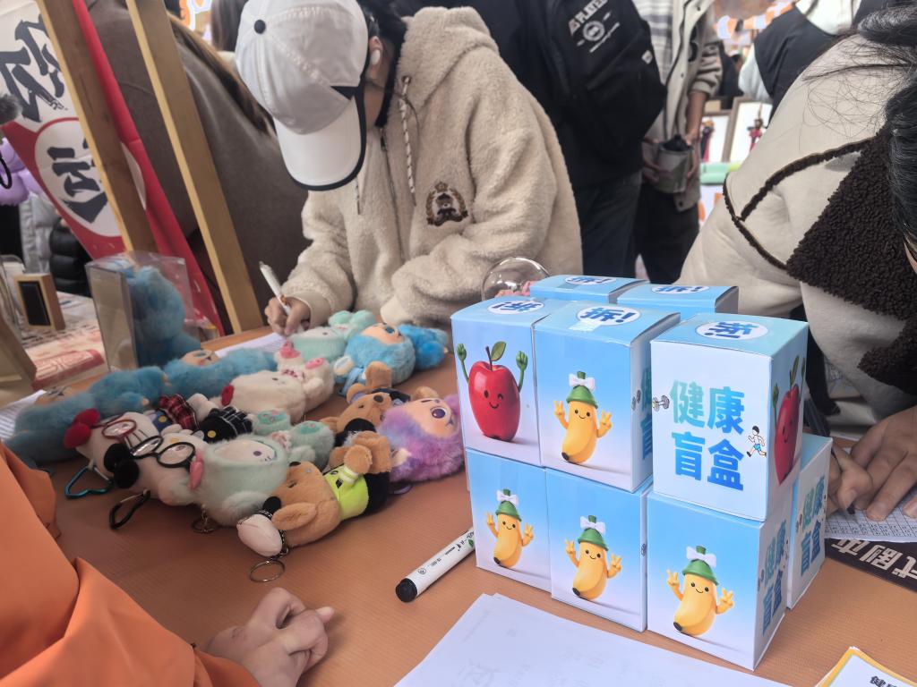 由护理系学生打造的“智健ON AIR·健康盲盒轻量站”摊位精彩亮相,吸引了众多师生驻足关注与热情选购。摊位上展示的并非传统商品,而是一个个以健康为主题的文创作品与健康打卡任务表,形式新颖、内容实用。活动以“互动+惊喜”的创新模式开启,参与者通过完成互动环节赢得开启盲盒的机会,将健康打卡转化为轻松有趣的体验,悄然传递健康生活理念,引导大学生关注身心健康,养成积极向上的生活方式。