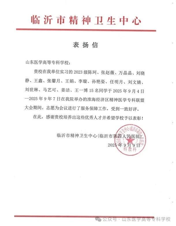近日,山东医学高等专科学校收到临沂市精神卫生中心发来的表扬信,对2023级15名实习生在淮海经济区精神医学专科联盟大会期间的志愿服务工作予以充分肯定。