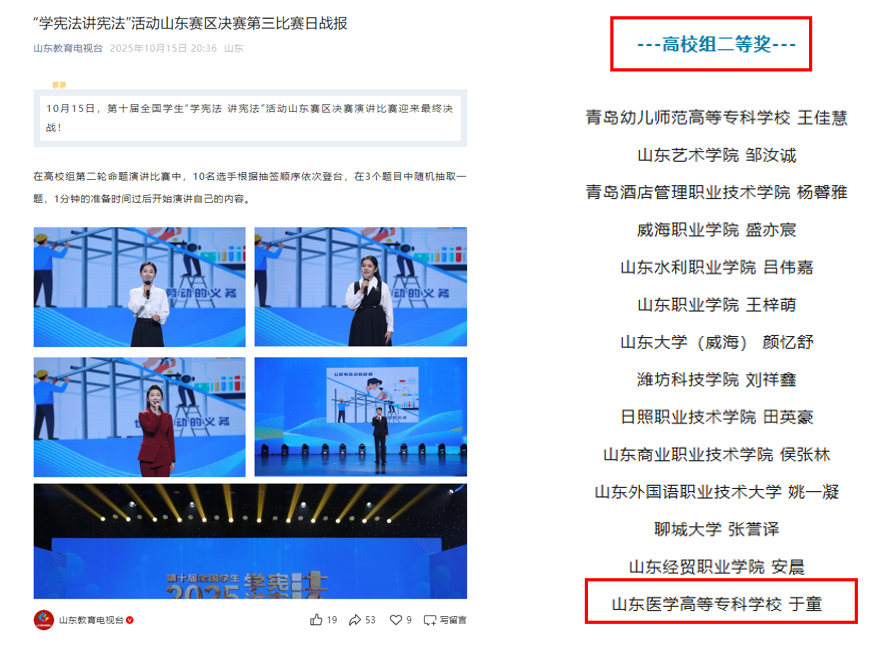 近日,由山东省教育厅主办的第十届全省学生“学宪法 讲宪法”演讲比赛山东赛区决赛落下帷幕。山东医学高等专科学校2024级护理14班于童凭借过硬实力斩获高校组二等奖。